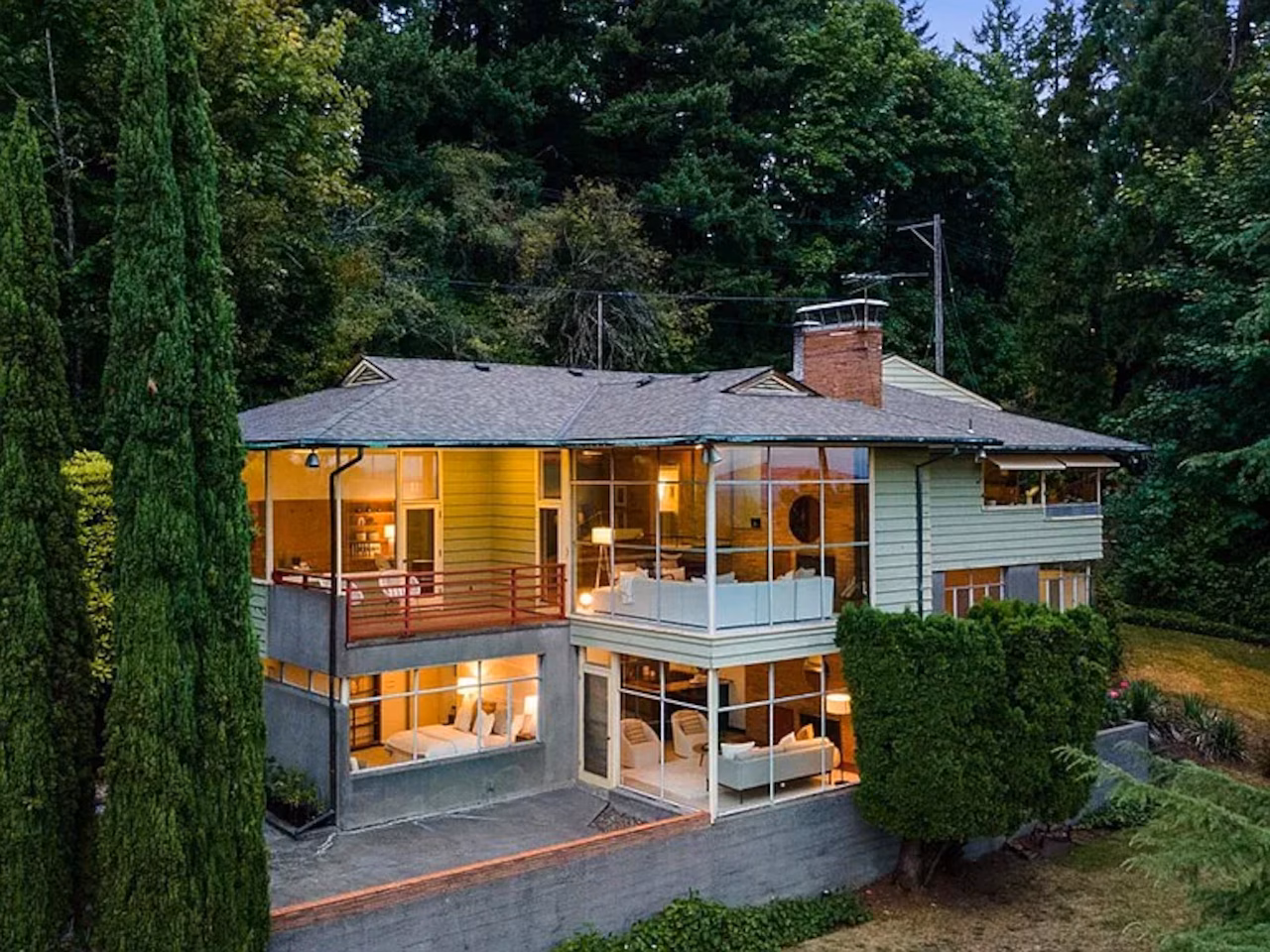Built in 1951 for steel company heir Robert Mercer, the two-level dwelling was designed by architect Derald Harbert, who also created the distinctive 1947 “Boomerang” house on Northwest Skyline Boulevard. That property was later expanded in 2020 by Giulietti Schouten Weber Architects.